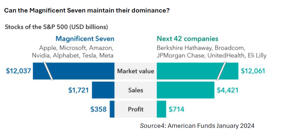 - The Magnificent Seven (M7) stocks contributed to nearly half of the stock market’s overall gain.